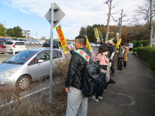 寒さが日ごとに厳しくなる中、参加学生は「シートベルト着用」「スピード注意」「運転中は携帯電話NG」等と書かれたサインボードを持ち、自動車やバイクに乗って3限の講義を受講する学生達に安全運転を心掛けるようアピールをしました。