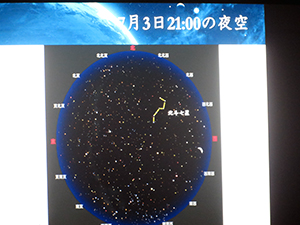 七夕が近いこともあり、はくちょう座や天の川など、七夕にちなんだ星空などを紹介したのち、宇宙の広大さや誕生についてお話頂きました。一生をかけても解明することができないような、ビッグバンやブラックホールの謎について聞き、宇宙の壮大さを実感しました。
