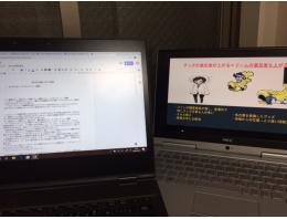 右のPC→オンライン上で資料を画面共有し、学生たちがプレゼンをしています。