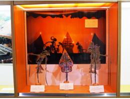 ワヤン・クリットは、インドネシアのジャワ島などで演じられる影絵人形劇です。中でも有名な演目の叙事詩「ラーマーヤナ」で用いられる、ラーマとシーターの人形を展示しました。上演の雰囲気を再現するため、照明の色を暗くしました。背景には実際の上演写真を用い、ワヤン・クリットとはどういうものか、視覚的に分かりやすく工夫しました。光と影が織りなす、伝統的で神秘的な世界をぜひ感じてください!