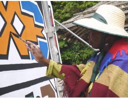 この日は、「男の東屋」の壁絵を上塗りする作業をサポートさせてもらいました。ここ「男の東屋」は、先回の活動日に白色のペイント作業を手伝った場所です。先回は雨模様であったため、雨の当たらない内側だけでしたが、今日は天気が良かったので、外側の壁をペイントできました。