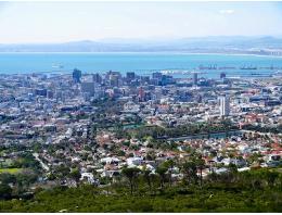 次に、テーブルマウンテンに行きましたが、強風のためロープーウェイが運休していたため登ることはできませんでした。テーブルマウンテンから少し離れたシグナルヒルからテーブルマウンテンの山頂を眺めました。