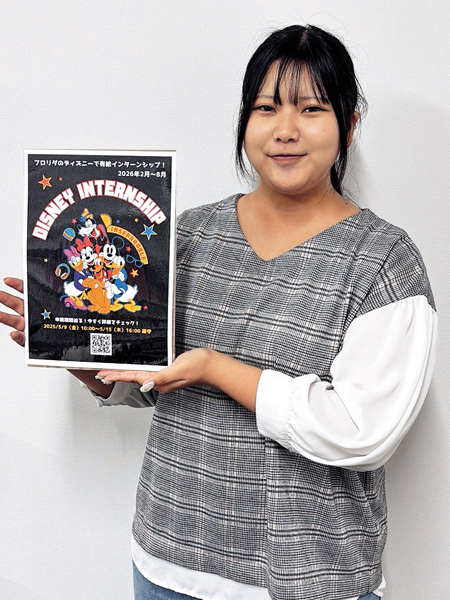 - 「ディズニー・インターンシッププログラム」に参加予定。このプログラムはセメスター留学の1つで、アメリカのフロリダ州にあるバレンシアカレッジ及びウォルト・ディズニー・ワールドと連携して、ビジネスマネジメントやホスピタリティ関連の授業と並行して、ディズニーワールドで有給インターンシップを行うというプログラムです。