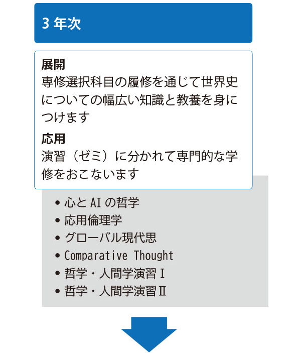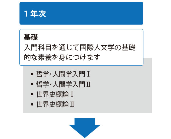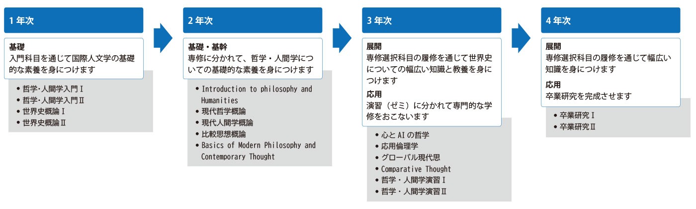 | 2年次 | Introduction to Philosophy and Humanities、現代哲学概論、現代人間学概論、比較思想概論、Basics of Modern Philosophy and Contemporary Thought |