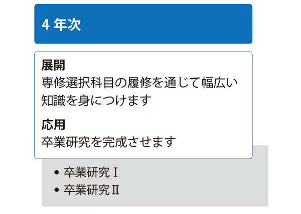 | 4年次 | 卒業研究Ⅰ、卒業研究Ⅱ |