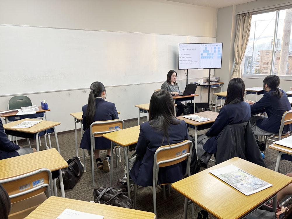 当日は、大学で行っているゼミの活動内容や、留学を通して得た経験などについて、具体的なエピソードを交えながら、わかりやすく紹介しました。実際の学生の視点から語られる話に、高校生たちは将来の自分を思い描きながら、興味深そうに話を聞いている様子でした。