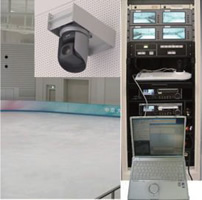 中京大学アイスアリーナに設置されている 4台の旋回型カメラを用いて,フィギュアスケート選手を自動追跡するシステムの開発を行っています.このシステムを使えば,4方向からの同時撮影はもちろん,4つの映像の良い部分だけをつなぎ合わせて 1本の演技ビデオを作ることも可能になり,トレーニングやコーチング等に役立つと考えられます.