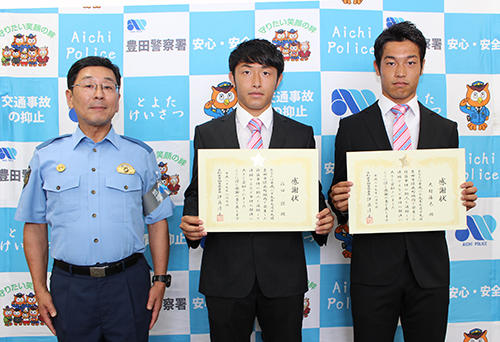 女性の下着窃盗の容疑者逮捕に協力したとして、8月7日、本学・スポーツ科学部4年の2人が、豊田警察署から感謝状が贈られた。