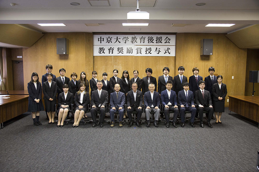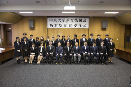 名古屋キャンパスのヤマテホールで授与式が行われ、会の冒頭で杉野邦廣・教育後援会長は「中京大学の学生に対するイメージについて、アンケートでは『個性的』『タフ』『エネルギッシュ』という評価を得ています。皆さんの持つ長所を伸ばして、個性的な社会人になってください。日頃の努力が実っての表彰です。これからも精進してください」と激励した。安村学長は「勉強で奨励賞を取ることは、両親や周りの人の支えがあってこそ。今日はご両親と一緒に喜んでください。本当におめでとうございます」と称えた。各学部、学科の代表者に杉野会長から表彰状が手渡され、学歌斉唱で幕を閉じた。