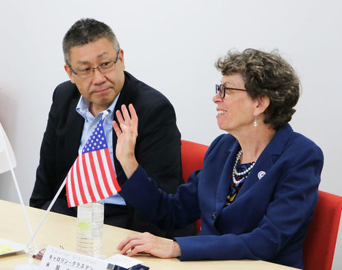 米国大使館の広報・文化交流担当公使キャロリン・グラスマン氏が9月25日、名古屋キャンパスを訪れ、総合政策学部学部長の大森達也教授が指導するゼミ学生5人、交換留学生2人と意見交換会を行った。