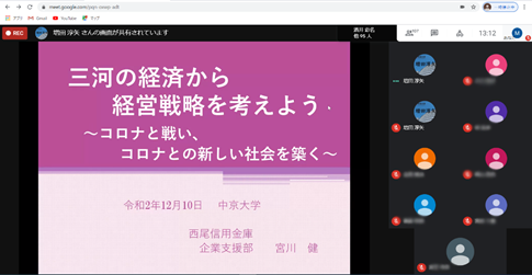 中京大学と西尾信用金庫は、2017年12月に学術研究の振興及び地域経済の発展に貢献することを目的に連携協力協定を結び、2018年から「新たな地域創生基盤基準の構築と西尾市経済への応用」共同研究を行っている。その活動の一つとして、地域経済の諸課題に関心を持ち、それを解決する意欲をもつ学生の育成を目的に、講演会などを開いている。