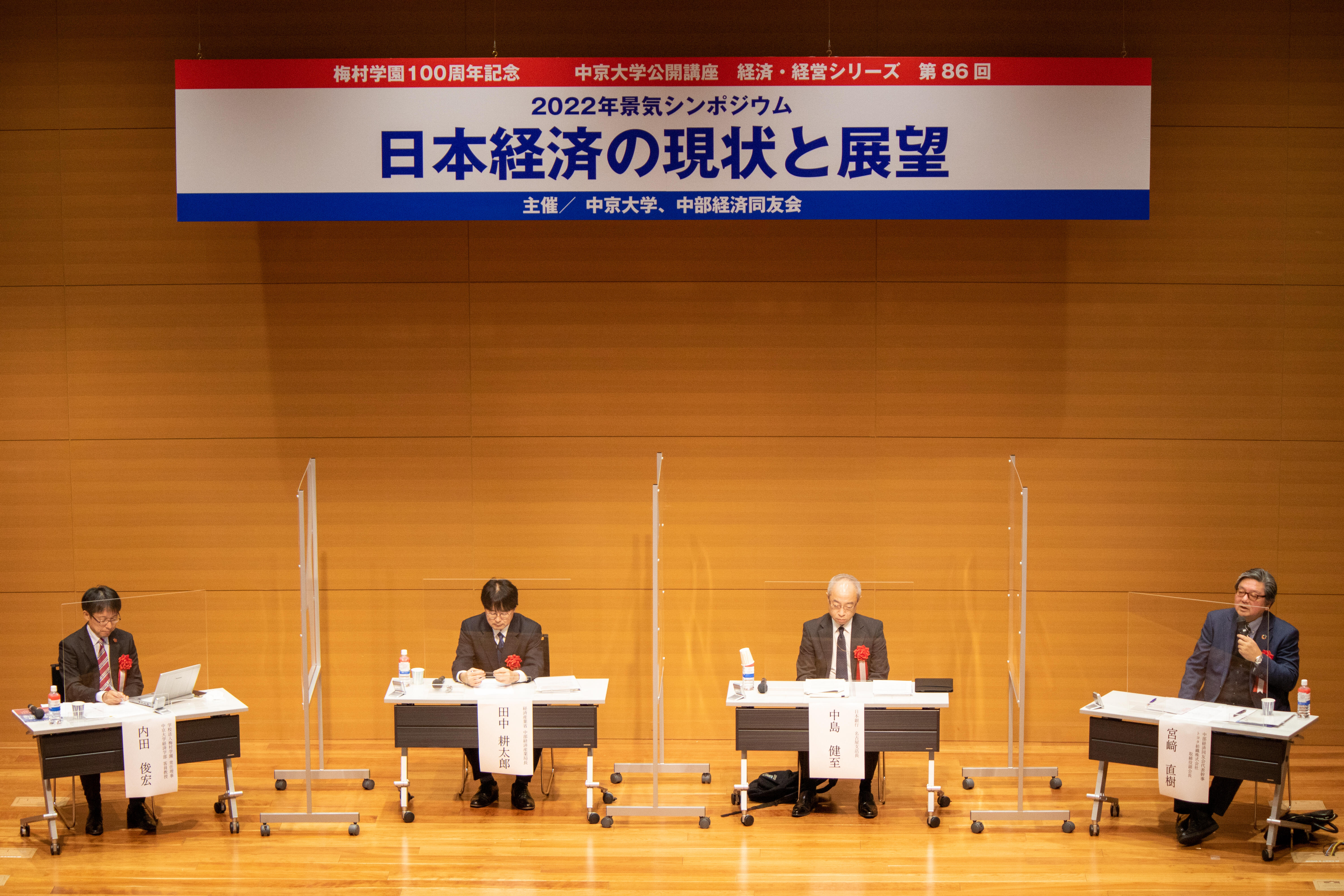 内田俊宏・梅村学園常任理事・経済学部客員教授がコーディネーターを務め、パネリストには田中耕太郎氏(経済産業省 中部経済産業局長)、中島健至氏(日本銀行 名古屋支店長)、宮﨑直樹氏(中部経済同友会代表幹事・トヨタ紡織株式会社 取締役副会長)が登壇しました。