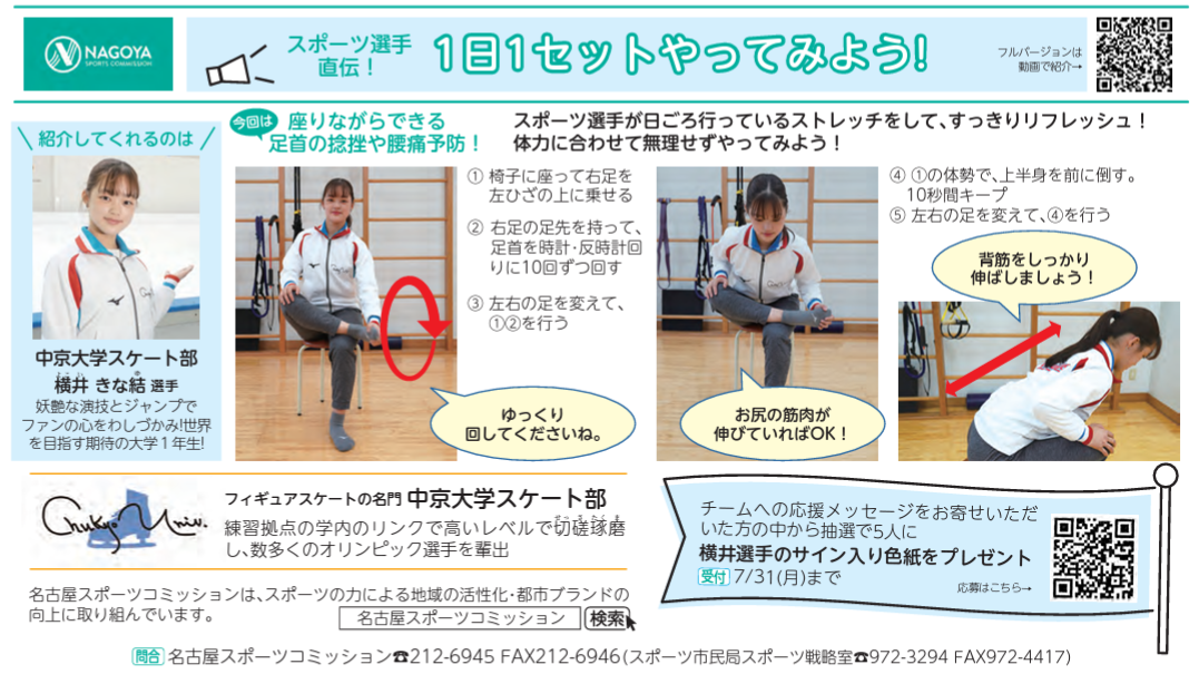 広報なごや7月号の「スポーツ選手直伝!1日1セットやってみよう!」のコーナーに、スケート部の横井きな結さん(スポーツ科学部1年生)が掲載されました。