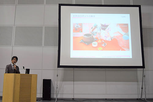 橋本教授は「道具の機能認識と生活支援ロボットへの応用」と題して、物の形や位置の認識だけでなく、物体の部位が持つ道具としての機能を認識する技術や、お茶を点てるなどの複数の道具を使いこなすタスクを自律的に実行する生活支援ロボットに応用した事例を紹介するとともに、同技術を次世代生産システムに適用する方法についても展望した。