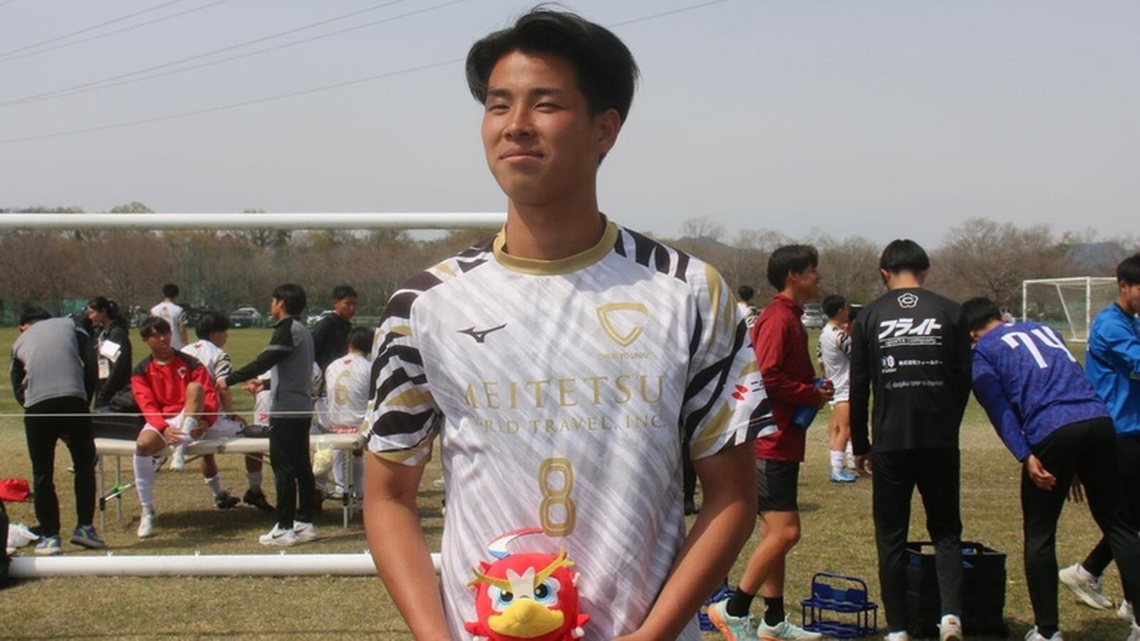 試合は3-1で中京大学が勝利を収め、開幕戦を白星でスタートしました。前半15分に1点を先制されたもののその10分後に光本和馬選手(スポーツ科学部4年)がゴールを決め、同点に追いつきました。後半に入ると11分に古瀬夢叶選手(スポーツ科学部2年)がヘディングでの逆転ゴール、さらには37分に小林嘉人選手(スポーツ科学部2年)が抜け出し左足で豪快なゴールを決め、チームを勝利に導きました。