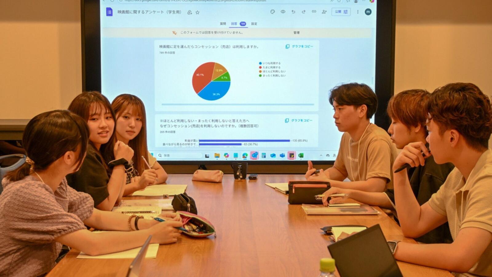 学生はコロナ禍で映画から離れてしまった若者に対して、もう一度映画の魅力を感じてもらいたいという思いから企画。映画についてのアンケート調査をSNSや学校内で実施し、約800件もの回答を収集しました。調査内容は好きな映画や値段など多岐にわたり、その成果は中日本興業の社員からも高く評価されました。